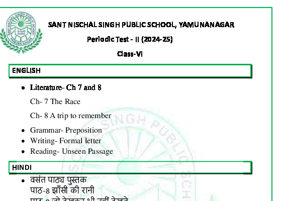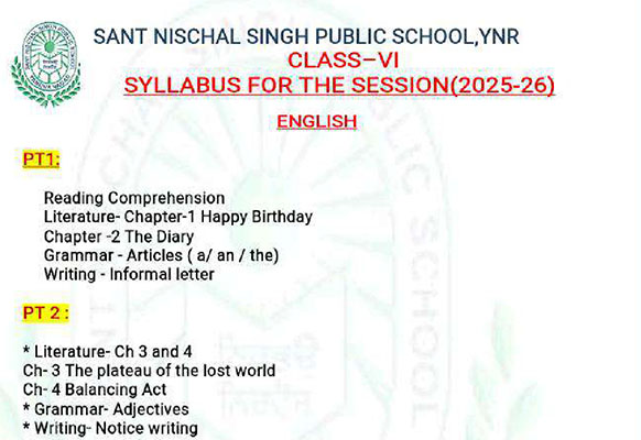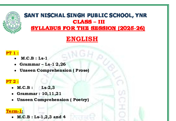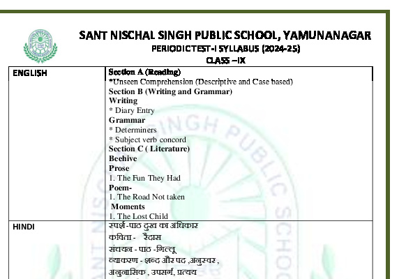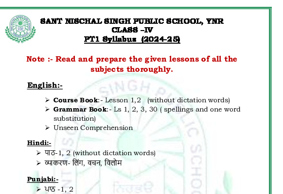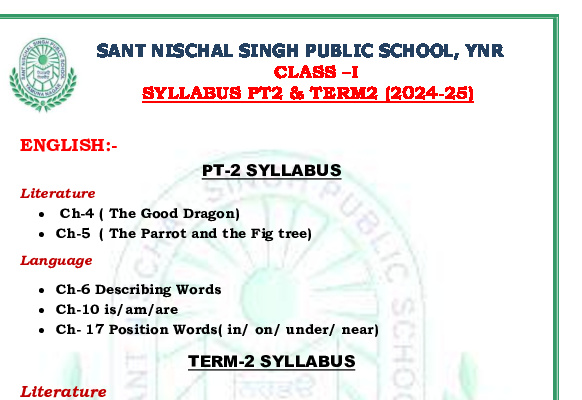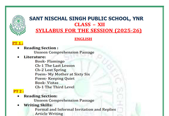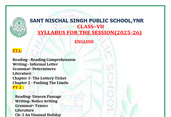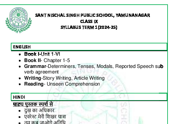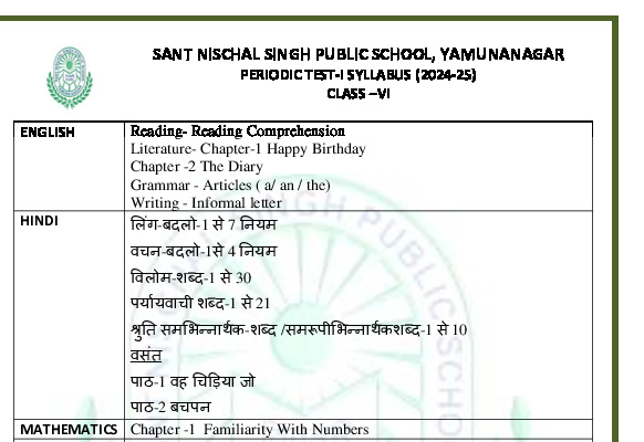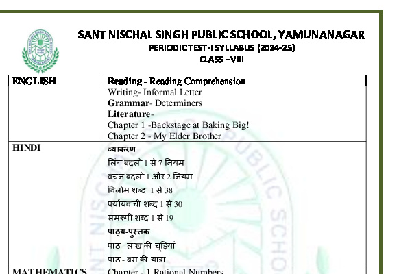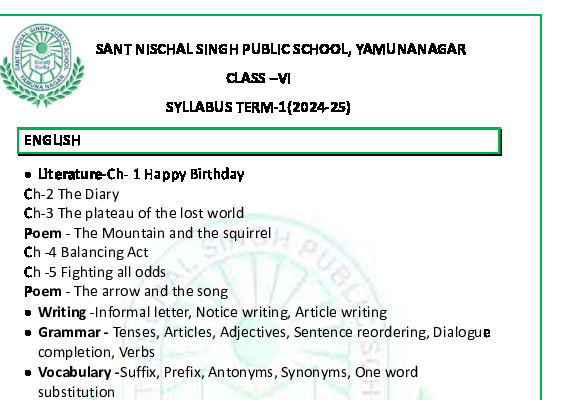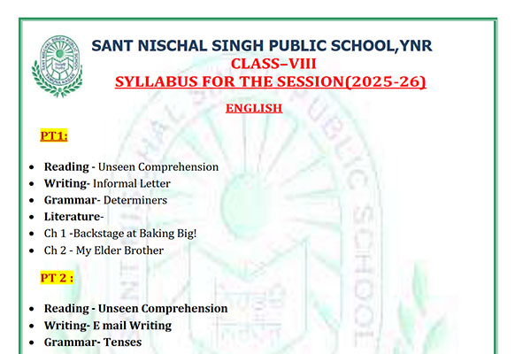 Syllabus Sant Nischal Singh Public School Download Files Class XII Syllabus (2025-26) Class XI Syllabus (2025-26) Class X Syllabus (2025-26) Class IX Syllabus (2025-26) Class VIII Syllabus (2025-26) Class VII Syllabus (2025-26) Class VI Syllabus (2025-26) Class V Syllabus (2025-26) Class IV Syllabus (2025-26) Class III Syllabus (2025-26) Class II Syllabus (2025-26) Class I Syllabus (2025-26) CL 11th PT-2 Syllabus (2024-25) CL 9th PT-2 Syllabus (2024-25) CL 8th PT-2 Syllabus (2024-25) CL 7th PT-2 Syllabus (2024-25) CL 6th PT-2 Syllabus (2024-25) CL 5 PT2 & Term-2 Syllabus (2024-25) CL 4 PT2 & Term-2 Syllabus (2024-25) CL 3 PT2 & Term-2 Syllabus (2024-25) CL 2 PT2 & Term-2 Syllabus (2024-25) CL 1 PT2 & Term-2 Syllabus (2024-25) Class XII Term-1 Syllabus (2024-25) Class XI Term-1 Syllabus (2024-25) Class X Term-1 Syllabus (2024-25) Class IX Term-1 Syllabus (2024-25) Class VIII Term-1 Syllabus (2024-25) Class VII Term-1 Syllabus (2024-25) Class VI Term-1 Syllabus (2024-25) Class 5 Term-1 Syllabus Class 4 Term-1 Syllabus Class 3 Term-1 Syllabus Class 2 Term-1 Syllabus Class 1 Term-1 Syllabus Class XII PT1 Syllabus (2024-25) Class XI PT1 Syllabus (2024-25) Class X PT1 Syllabus (2024-25) Class IX PT1 Syllabus (2024-25) Class VIII PT1 Syllabus (2024-25) Class VII PT1 Syllabus (2024-25) Class VI PT1 Syllabus (2024-25) Class 5th PT1 Syllabus Class 4th PT1 Syllabus Class 3rd PT1 Syllabus Class 2nd PT1 Syllabus