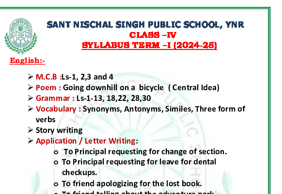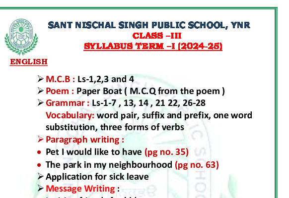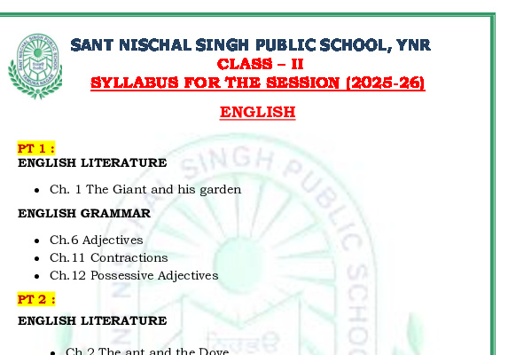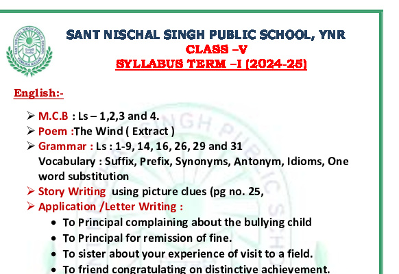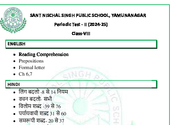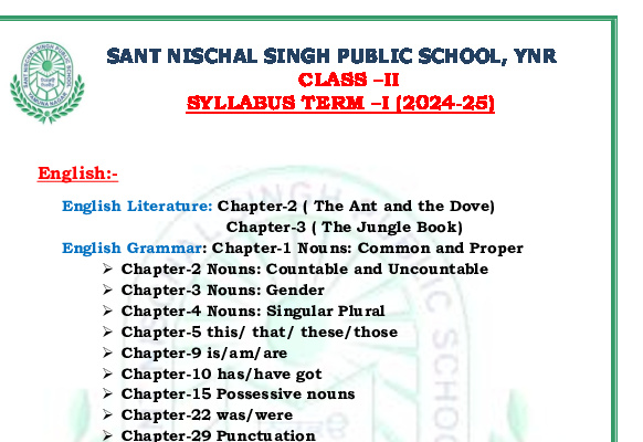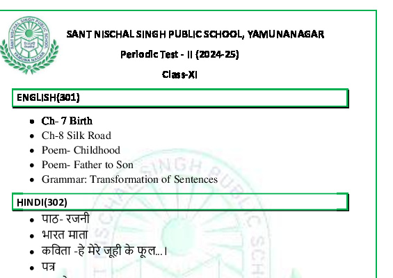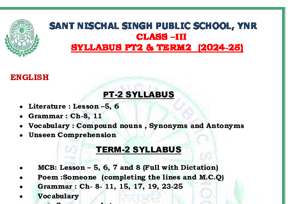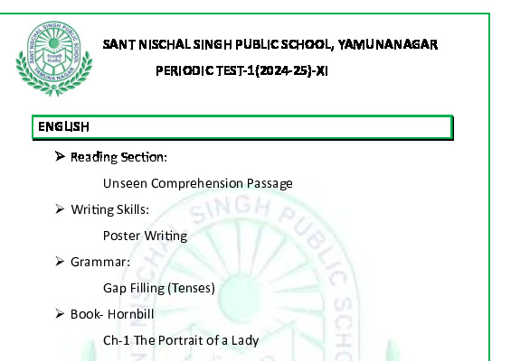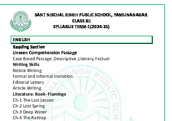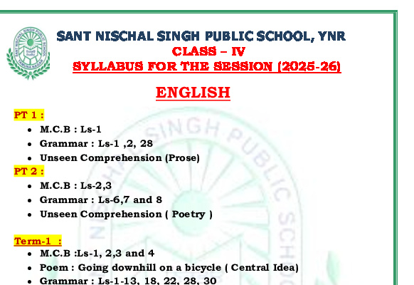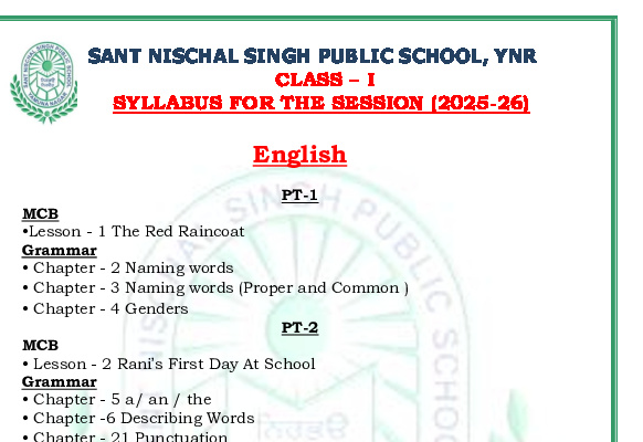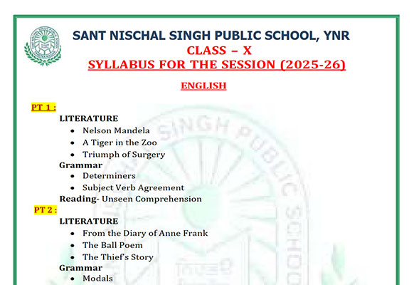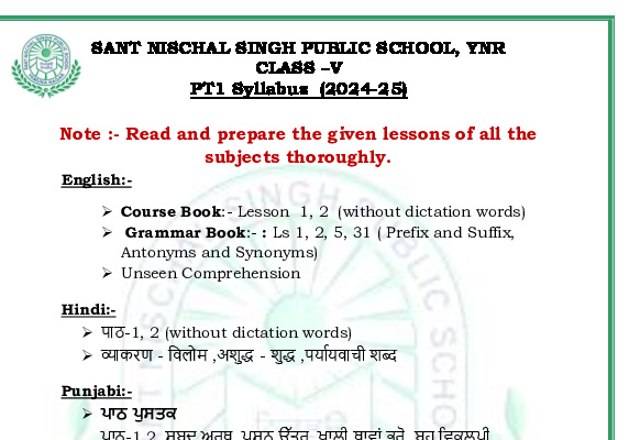 Syllabus Sant Nischal Singh Public School Download Files Class XII Syllabus (2025-26) Class XI Syllabus (2025-26) Class X Syllabus (2025-26) Class IX Syllabus (2025-26) Class VIII Syllabus (2025-26) Class VII Syllabus (2025-26) Class VI Syllabus (2025-26) Class V Syllabus (2025-26) Class IV Syllabus (2025-26) Class III Syllabus (2025-26) Class II Syllabus (2025-26) Class I Syllabus (2025-26) CL 11th PT-2 Syllabus (2024-25) CL 9th PT-2 Syllabus (2024-25) CL 8th PT-2 Syllabus (2024-25) CL 7th PT-2 Syllabus (2024-25) CL 6th PT-2 Syllabus (2024-25) CL 5 PT2 & Term-2 Syllabus (2024-25) CL 4 PT2 & Term-2 Syllabus (2024-25) CL 3 PT2 & Term-2 Syllabus (2024-25) CL 2 PT2 & Term-2 Syllabus (2024-25) CL 1 PT2 & Term-2 Syllabus (2024-25) Class XII Term-1 Syllabus (2024-25) Class XI Term-1 Syllabus (2024-25) Class X Term-1 Syllabus (2024-25) Class IX Term-1 Syllabus (2024-25) Class VIII Term-1 Syllabus (2024-25) Class VII Term-1 Syllabus (2024-25) Class VI Term-1 Syllabus (2024-25) Class 5 Term-1 Syllabus Class 4 Term-1 Syllabus Class 3 Term-1 Syllabus Class 2 Term-1 Syllabus Class 1 Term-1 Syllabus Class XII PT1 Syllabus (2024-25) Class XI PT1 Syllabus (2024-25) Class X PT1 Syllabus (2024-25) Class IX PT1 Syllabus (2024-25) Class VIII PT1 Syllabus (2024-25) Class VII PT1 Syllabus (2024-25) Class VI PT1 Syllabus (2024-25) Class 5th PT1 Syllabus Class 4th PT1 Syllabus Class 3rd PT1 Syllabus Class 2nd PT1 Syllabus